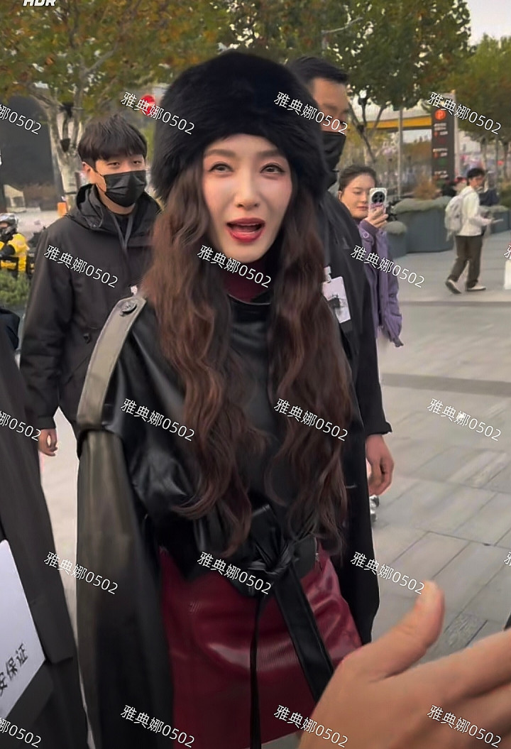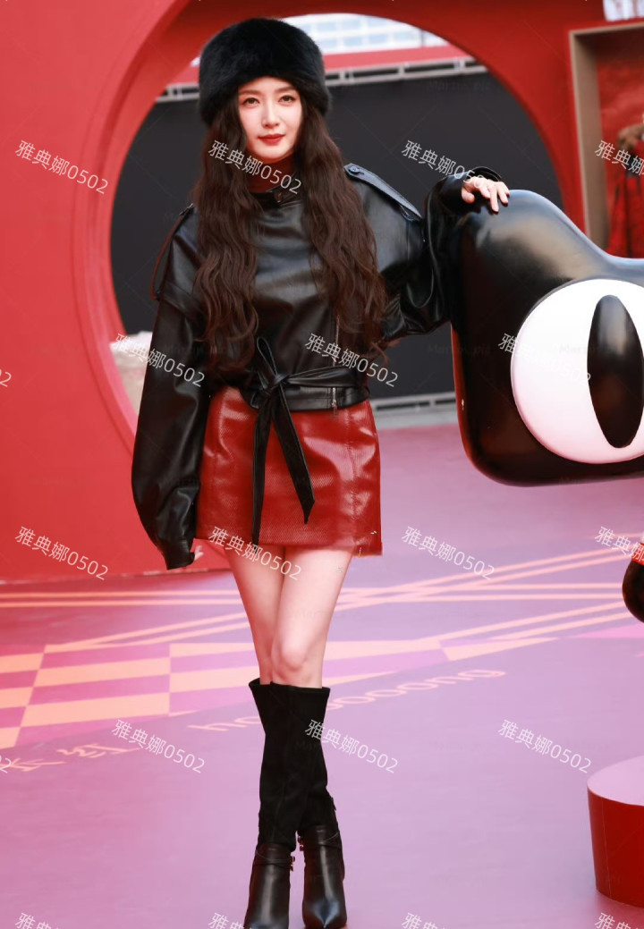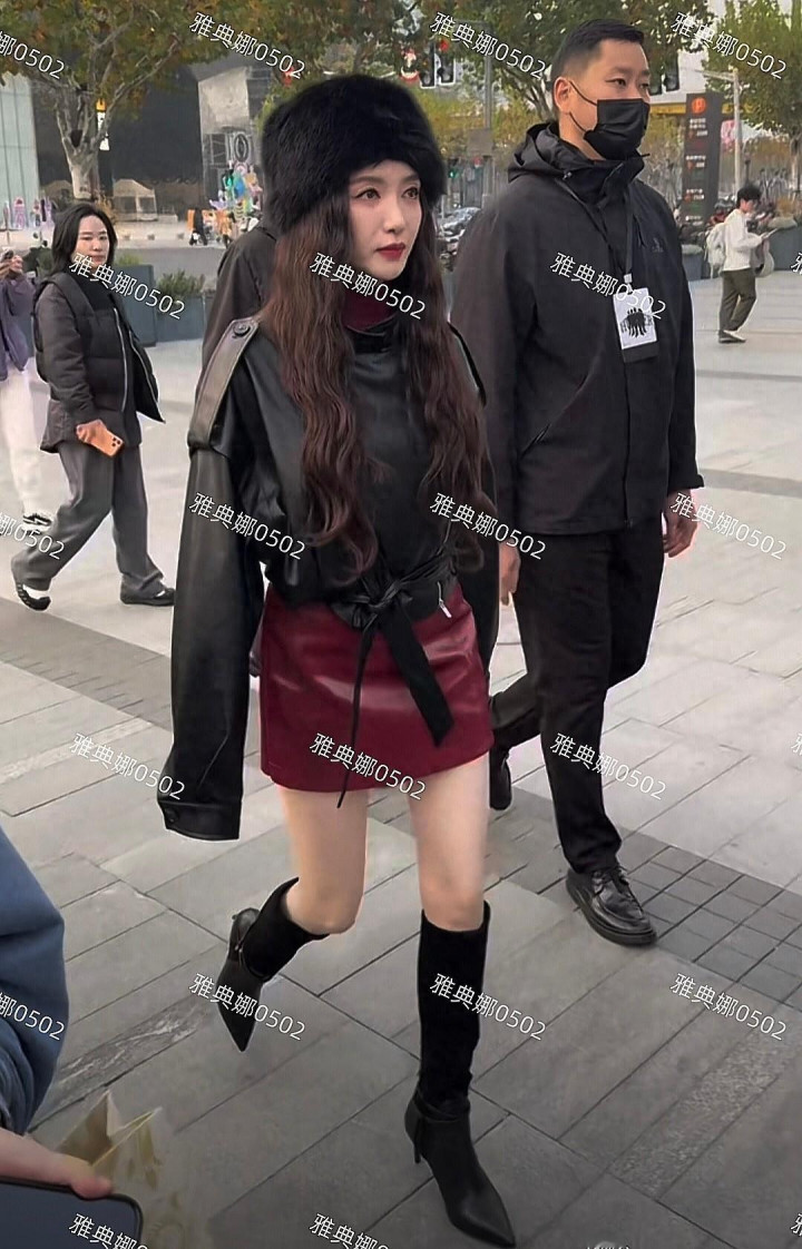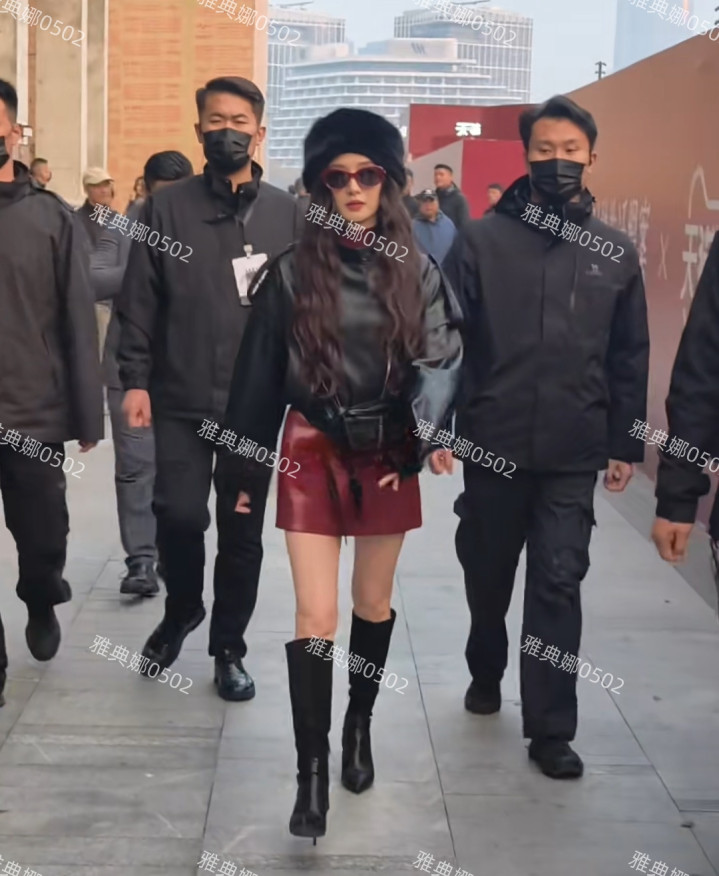 今天江疏影以一身黑色皮夹克配红色皮裙和长筒靴亮相上海出席活动,头上还戴了一顶皮草帽子嘴上化了大红唇,她穿着高跟鞋在保镖的簇拥下走过来的时候,感觉她身上女神的优雅气质不见了,反而多了几分匪气,连她自己的粉丝都有点儿不习惯这个造型。